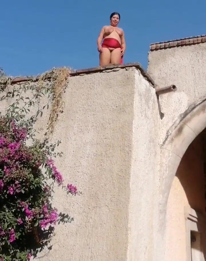 Devska pees from the roof of ranch over admirers